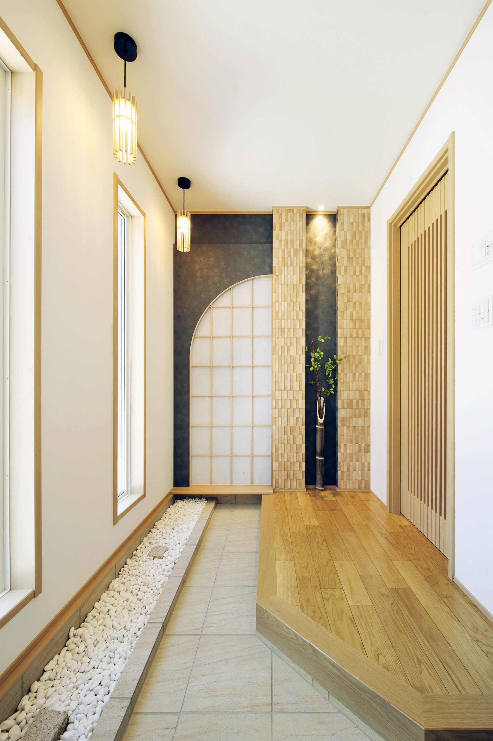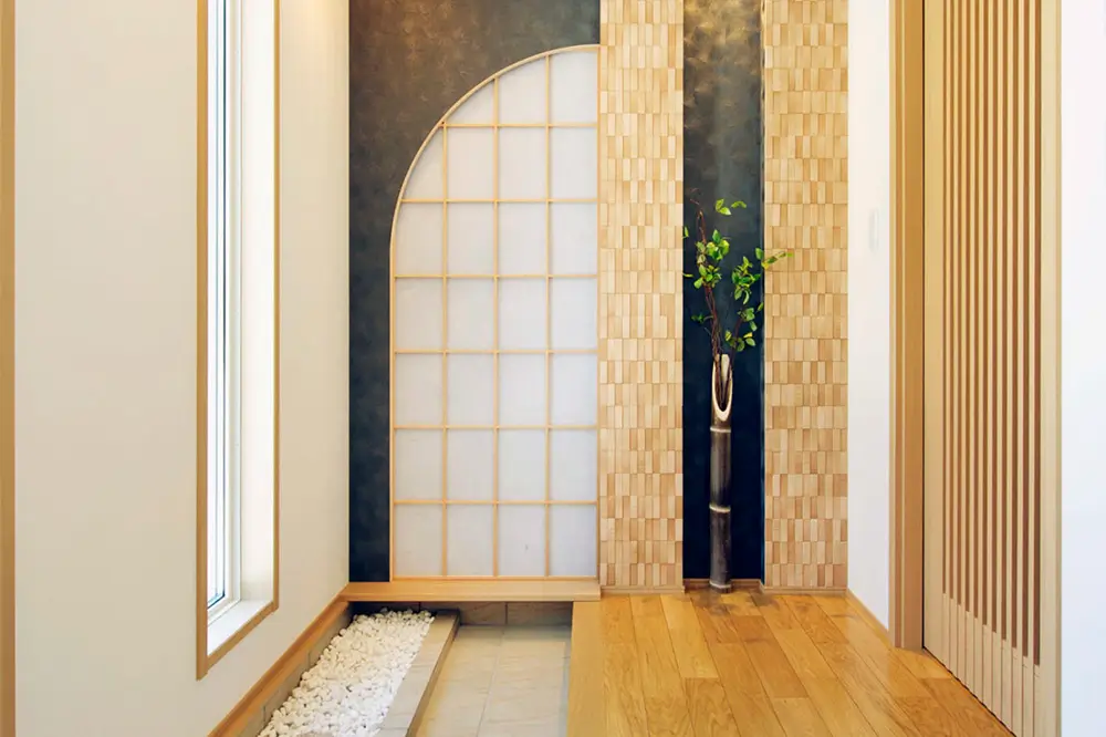 障子の壁と足元の白い玉砂利が印象的な玄関ホール。訪れた人をおもてなしする高級旅館をイメージした。