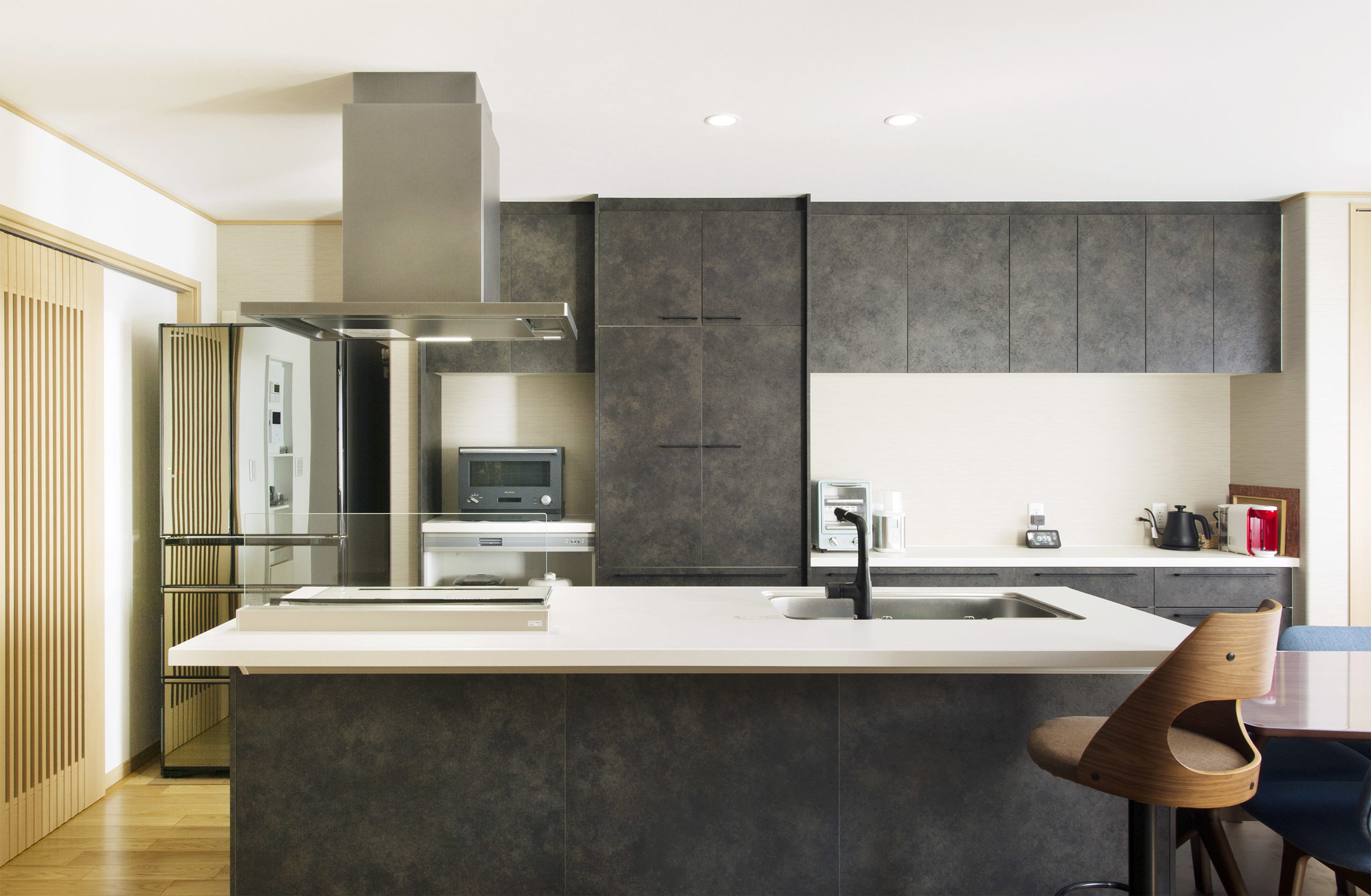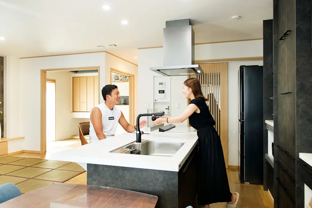 リビングも和室も見渡せるようにアイランドキッチンを配置。キッチンの輻広カウンターに スツールを置いてBarのようにお酒を片手に夫婦の語らいの場にも。
