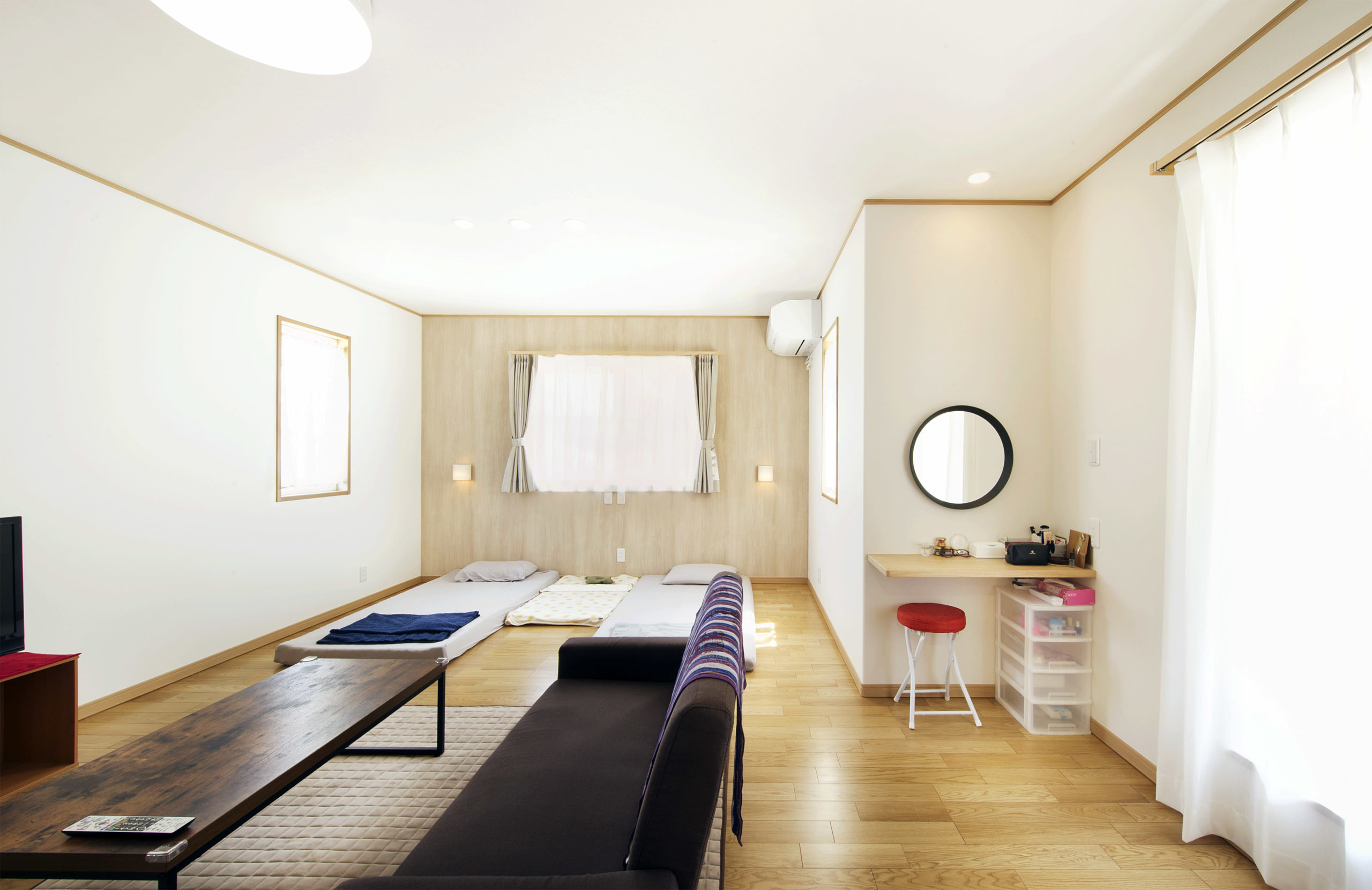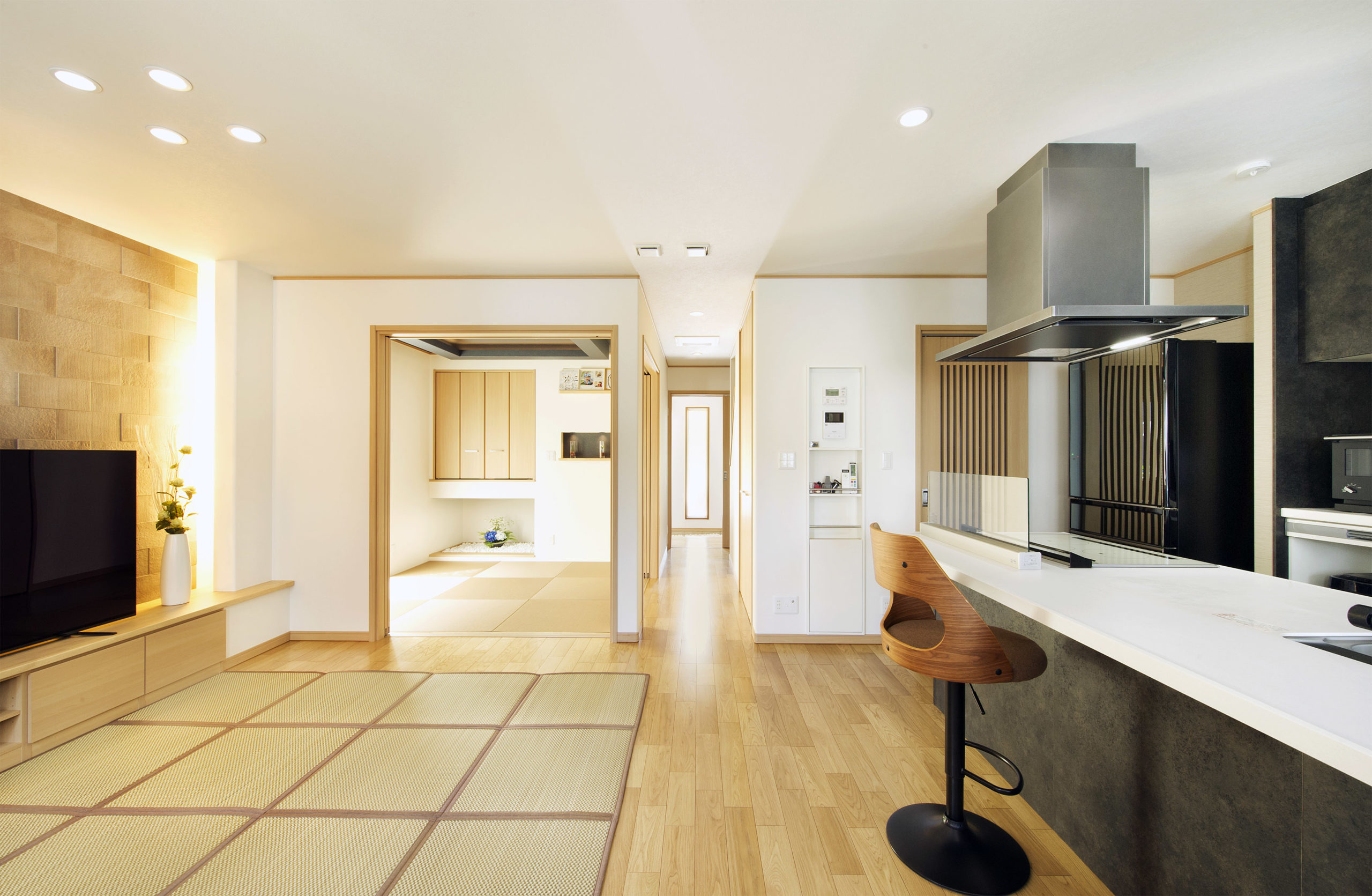 やさしい茶と白でまとめられた明るいLDKと和室。テレビや和室の天井などの黒が空間を引き締めるアクセントに。