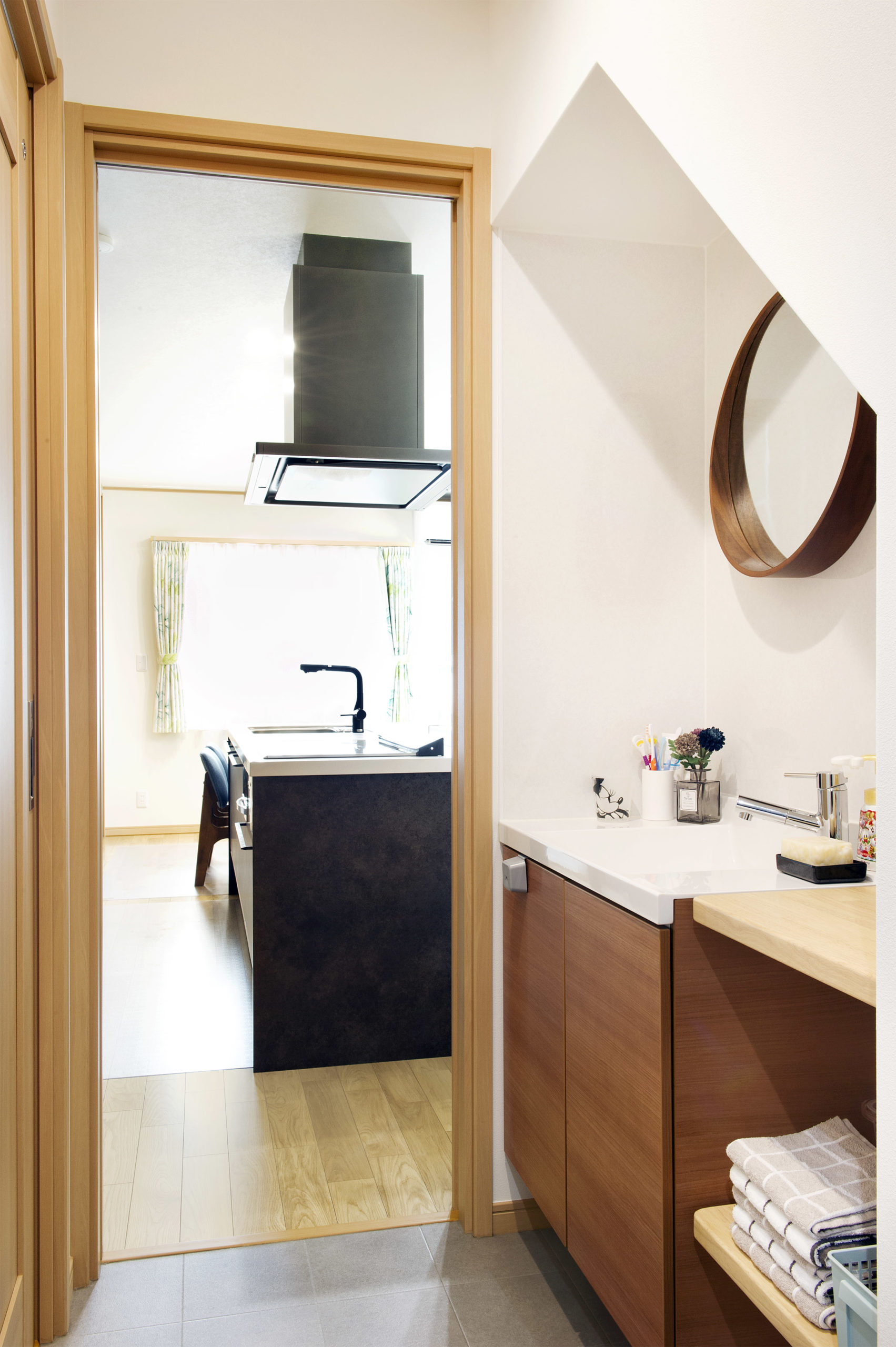 脱衣室から独立させた洗面台。家事動線上にあるので使いやすく効率もUP。