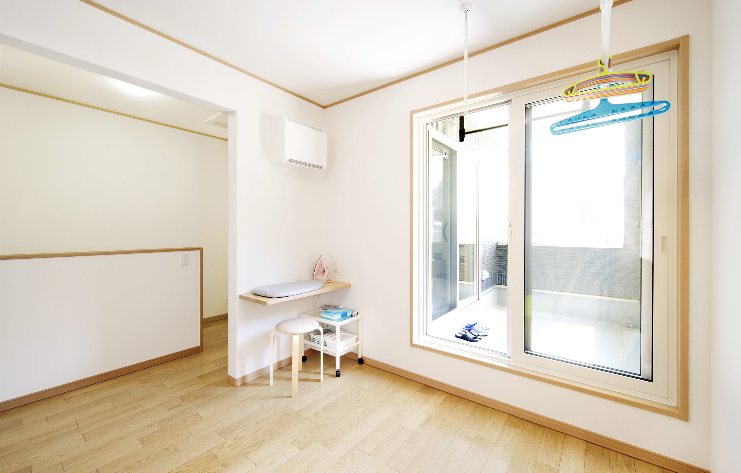 2階ホールには洗濯物干しとアイロン掛けができるカウンターを設置。 将来、個室としてリフォーム可能な作りにしている。
