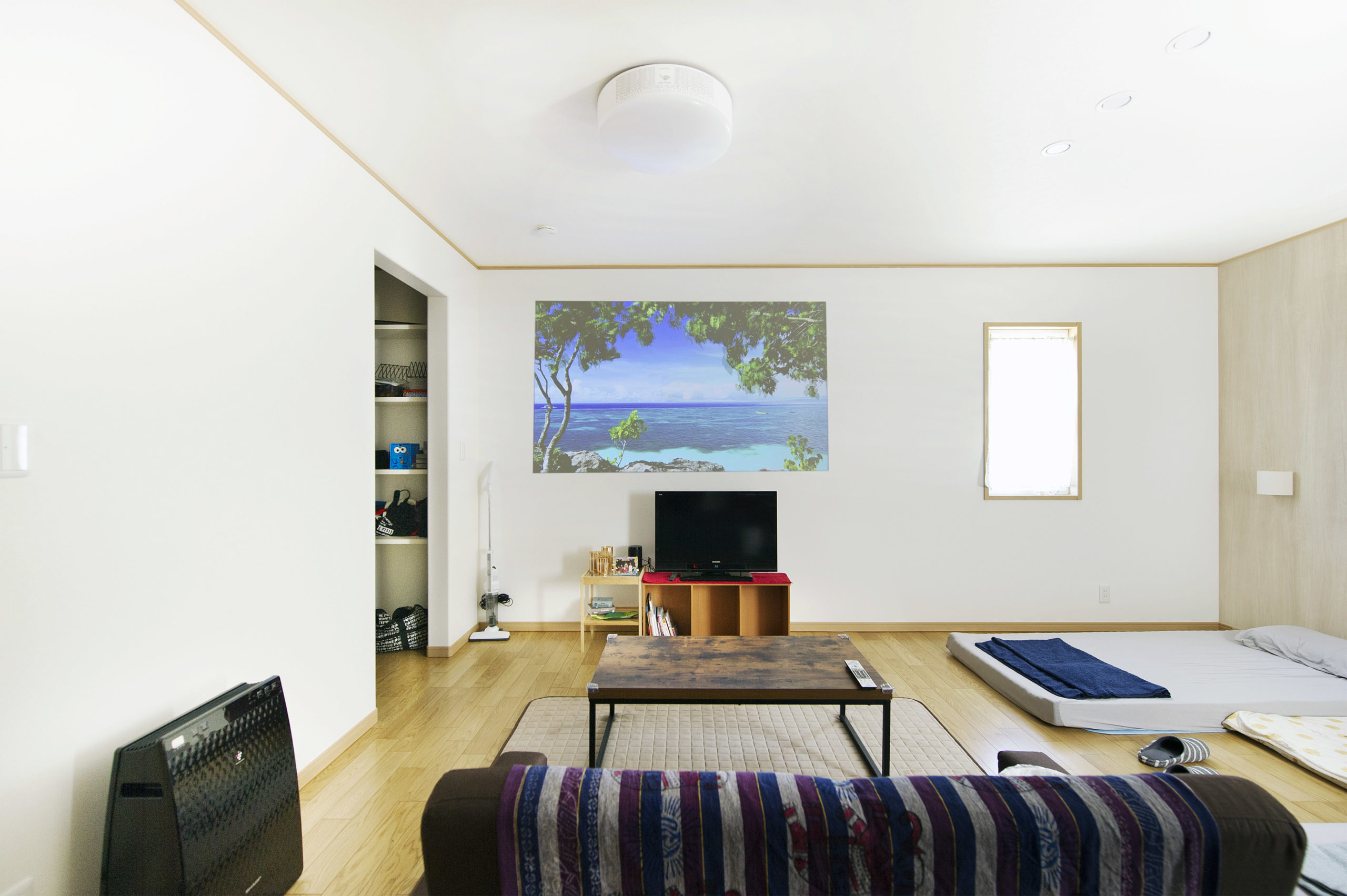 間接照明が映える折り上げ天井と吊収納のある和室。空間の贅沢な使い方が住まいにゆとりをもたらしている。